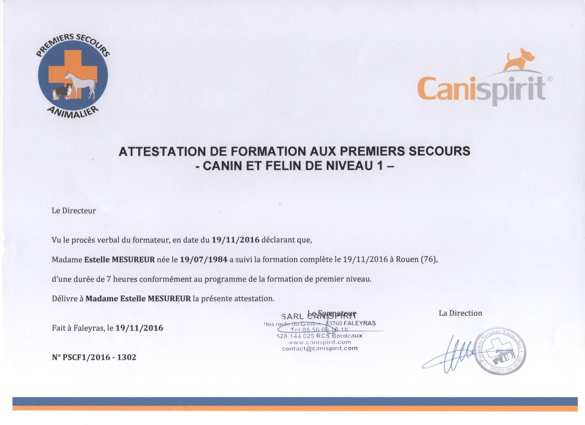 - 2016 : Attestation de formation aux premiers secours - canin et félin - de niveau 1 par Canispirit