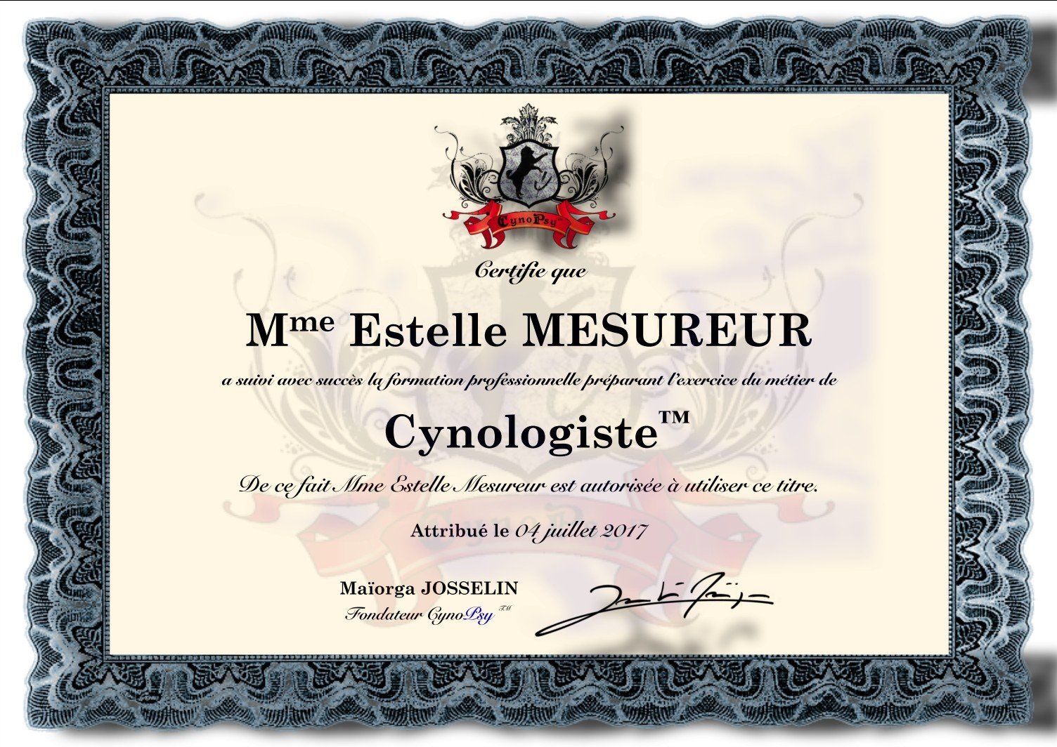 - De 2014 à 2017 : Formation de Cynologiste - Diplomée en 2017 par Maïorga JOSSELIN